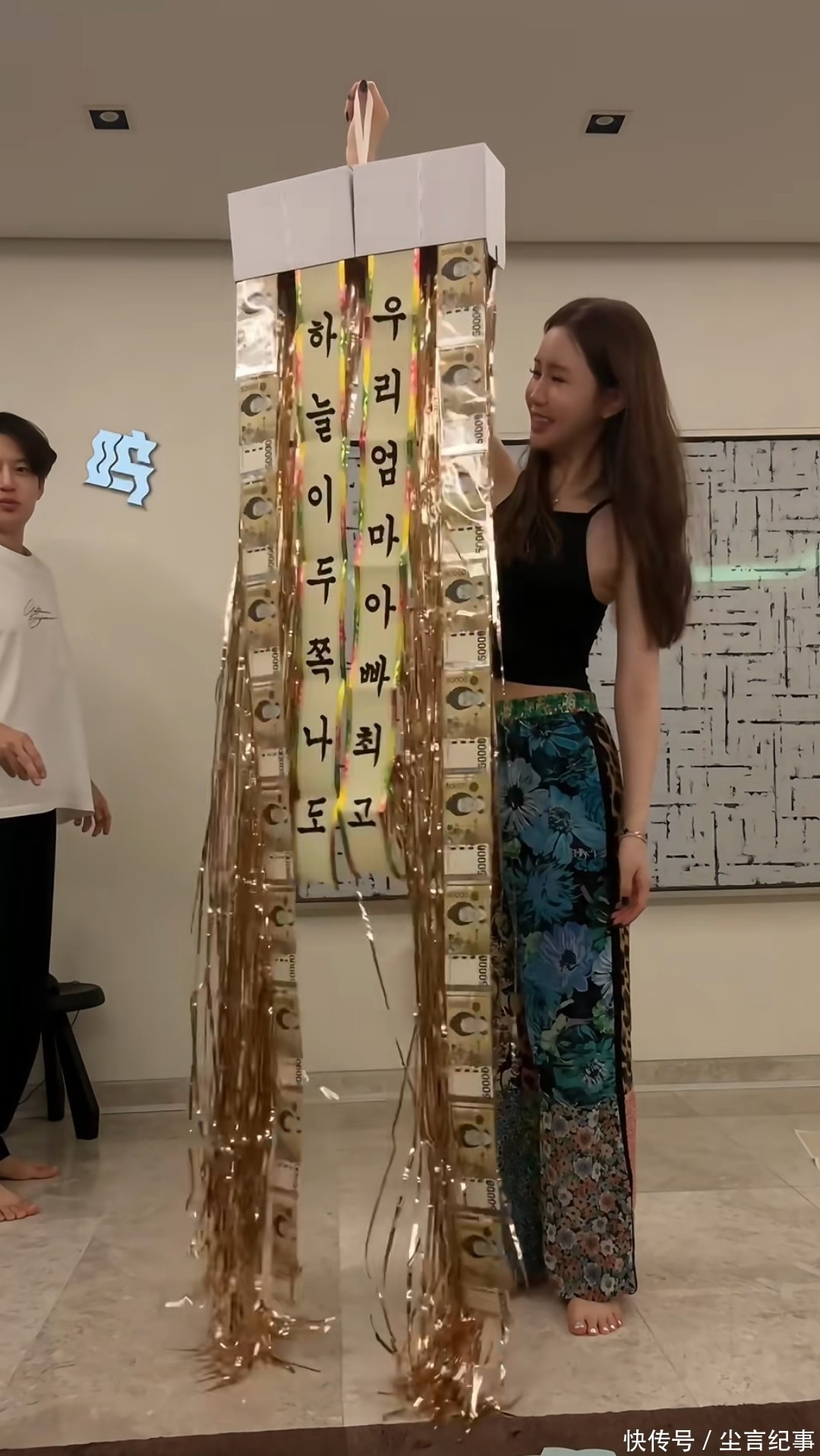 盒子里装着彩带还有准备的祝福语,还��面值的韩元,约人民币四五千块钱,盒子只要一拉绳,彩带就会直接垂下来,的确给人惊喜。